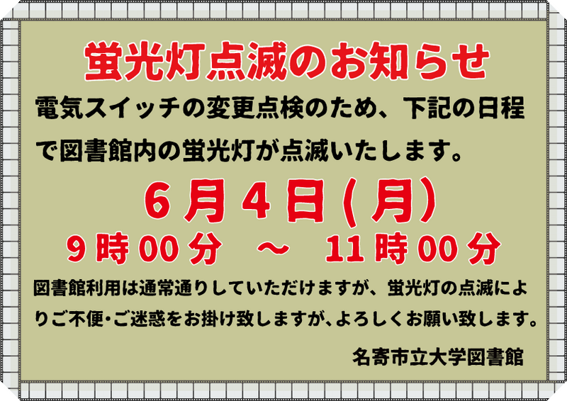 電気スイッチ変更点検のため、下記の日程で図書館内の蛍光灯が点滅いたします。