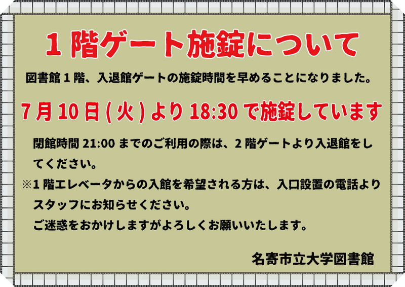 図書館1階、入退館ゲートの施錠時間を早めることになりました。