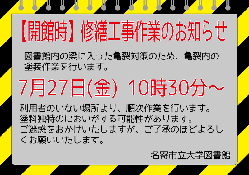 図書館内の梁に入った亀裂対策のため、亀裂内に樹脂を注入する作業を課金一定で行います。